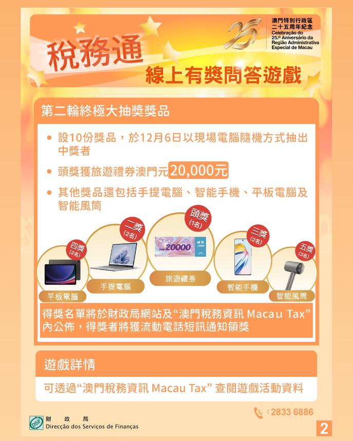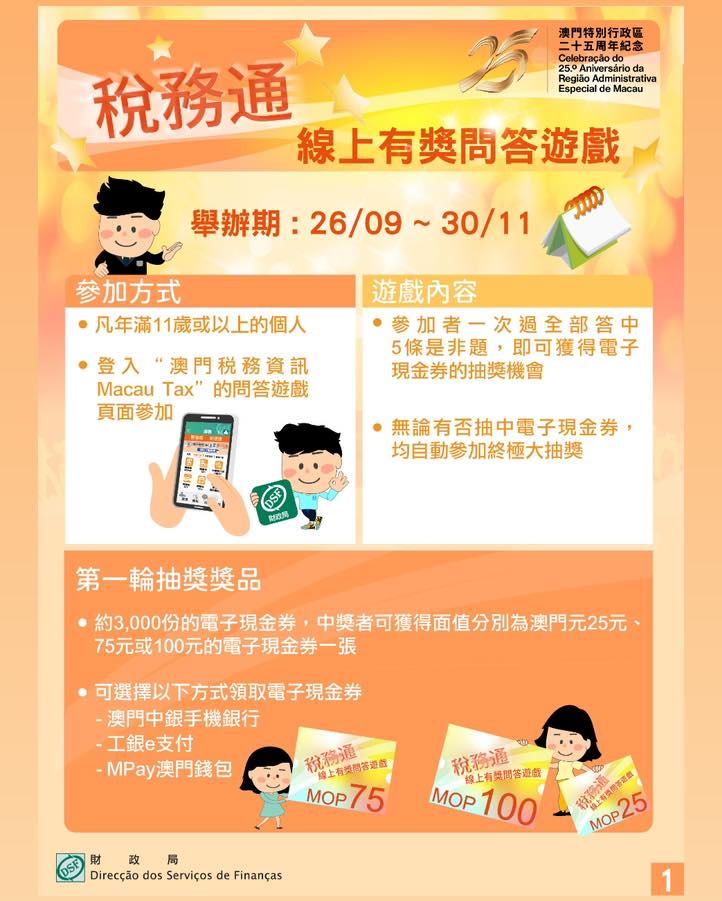 為慶祝澳門回歸祖國25周年,財政局於9月26日至11月30日期間推出“稅務通"線上有獎問答遊戲活動,冀望市民透過遊戲加深對稅務法例的認識,並鼓勵市民利用財政局移動應用程式“澳門稅務資訊Macau Tax”辦理稅務手續,實行與眾同樂共慶回歸。