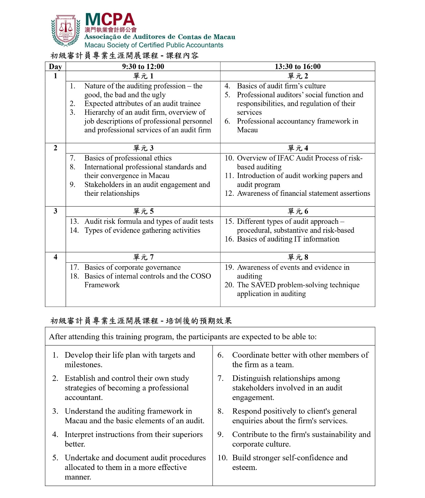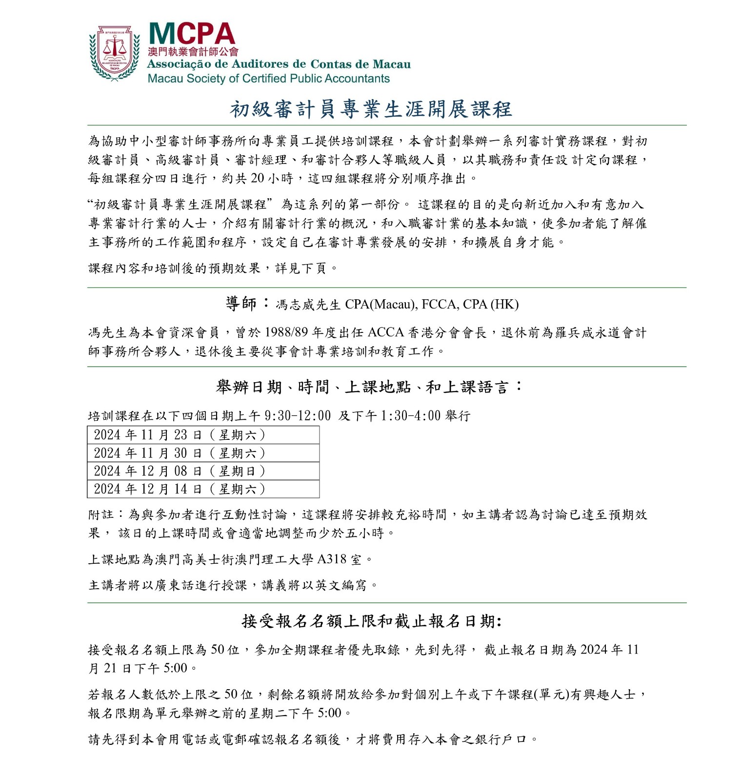 澳門執業會計師公會將於2024年11月23日、30、12月08日及14日假澳門理工大學 (澳門高美士街澳門理工大學 A318室)舉辦《初級審計員專業生涯開展課程》,即日起開始接受報名,報名截止日期:2024年11月21日,名額有限,先到先得。